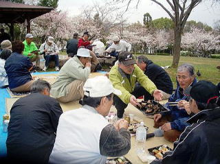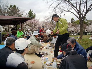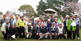 1月19日から着手した八幡安居塚・白井フィールドの竹林整備を3月中に終えた耕春会の面々は4月1日、互いの慰労を兼ねた花見のつどいを男山のさくら公園で開きました。この日は朝から雨模様とあって、さくら公園はほぼ貸し切り状態。花見の時間中は、不思議と晴れるなど天も味方につけた和気あいあいのいい花見会でした(=写真)。