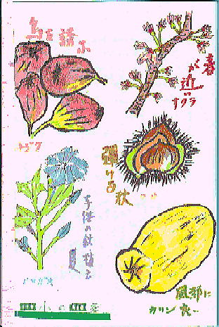 記念誌はA4版、56ページ建て手作りの立派なもの。裏表紙には、学校の校庭で育っているサクラやアサガオをはじめクリ、イチジク、カリンの実を鮮やかな彩で描いています。文中には、校長先生や教育委員会の感謝の言葉やボランティア参加者の手記、子どもたちの感謝の気持ちをこめた寄せ書きや