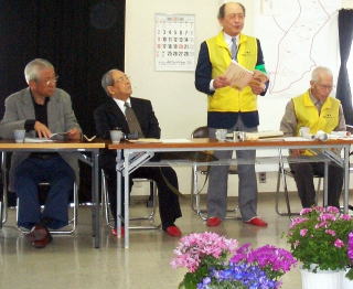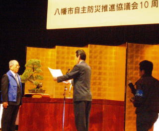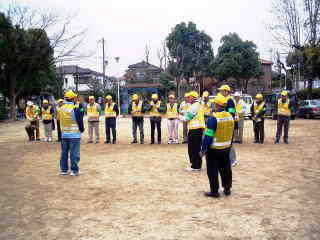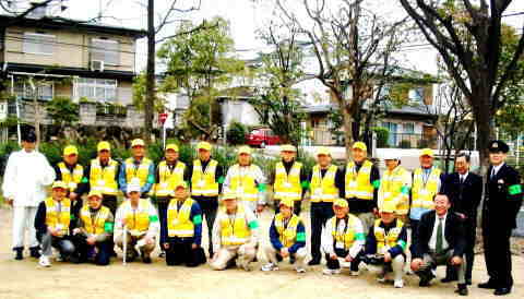 「地域防犯は地域住民の手で」と3月27日、吉井松里町内会の防犯パトロール隊が結成されました。小雨交じりのこの日、式典のあった男山松里地区のめじろ公園には、そろいの黄色い帽子とベスト、緑の腕章で身を固めた吉川幾久雄町内会長以下19人の隊員が勢揃い。吉川会長は「退職後、何か地域に恩返しできないかとみんなで考え、実行に移した」とあいさつ。式典には、市職員と八幡署員もかけつけ、パトロール隊の発足を激励、隊員たちは意気揚々と公園デビューを果たしました。地域自治会単位の防犯パトロール隊の誕生は市内で初めて。