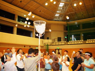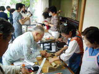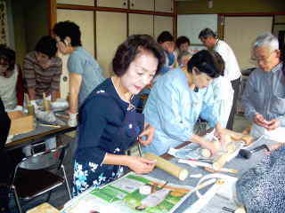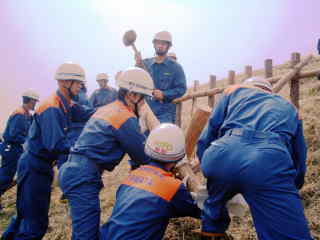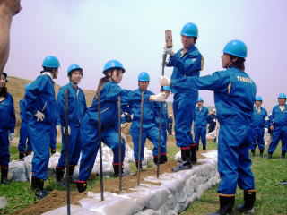 全員で土のう作りをしたあと、各グループに分かれて積み土のう、杭打ち積み土のう、釜段、月の輪の4つの工法を用いて土のうを積み上げました。