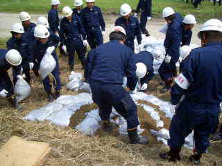 6月7日、市内川口浜の木津川左岸堤防で、雨期を前に住民の生命・財産を水害から守ろうと市消防団員・同消防本部・市役所の職員が合同で水防工法の基礎訓練を実施しました。
