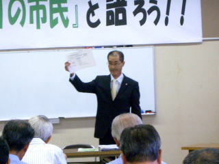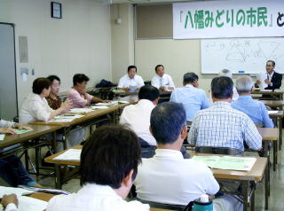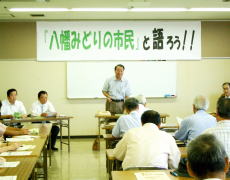 市議会会派・八幡みどりの市民(菱田明儀代表、鷹野宏議長、小北幸博議員、上谷耕造の4人)は、9月23日、市文化センターで、後期高齢者医療制度の勉強会と市政課題について市民の皆さんと語り合う集いを開きました(=写真)。