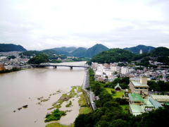 【写真】上は、犬山祭で曳かれる山車13輌のひとつ(どんでん館)。下左から、歴史まちづくり法にもとづく電柱の地中化などで道路や街並みが整備され、落ち着いた景観の旧市街地・本町通。保健・福祉・医療が一体となった温泉付きの市民健康館「さら・さくら」。国宝犬山城。連日の雨で水嵩が増し茶色く濁った木曽川。「名物の鵜飼」も長らく開かれていないという。
