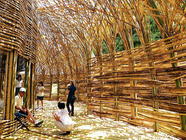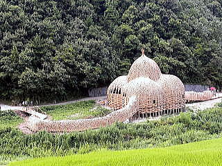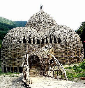 ▼小豆島「竹の家」 ▼棚田のなかの「竹の家」全景 ▼「竹の家」の内部