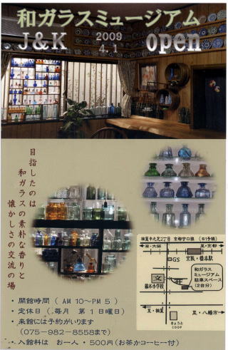 八幡まるごとミュージアムにふさわしい”まちの小さな美術館”、和ガラスミュージアムJ&Kが八幡市内に4月1日、オープンしました。展示蒐集品は、ラムネや醤油、香水、薬などの様々な時代のビンの入れ物やガラスのコップ類、色んな絵柄が描かれた瀬戸物の皿などのほか、オーナーご自慢の500色ものカラー鉛筆のグラデーションも。自宅を改造した室内には、ビールの懐かしい広告ポスターなども掲げられていて、レトロな雰囲気で一杯でした。